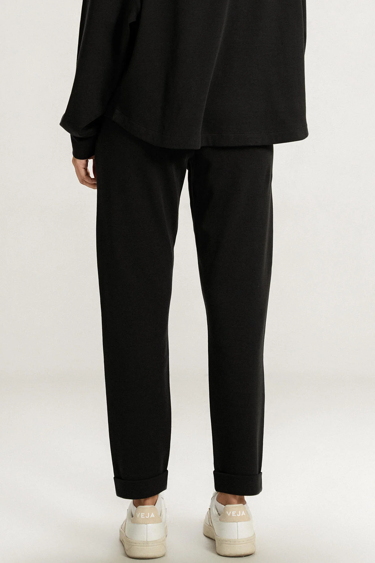 Turn-up cuff pants in black, featuring a regular fit, offer a sleek and comfortable look. Perfect for casual wear, these joggers combine style and ease for everyday comfort with a modern, minimalist edge