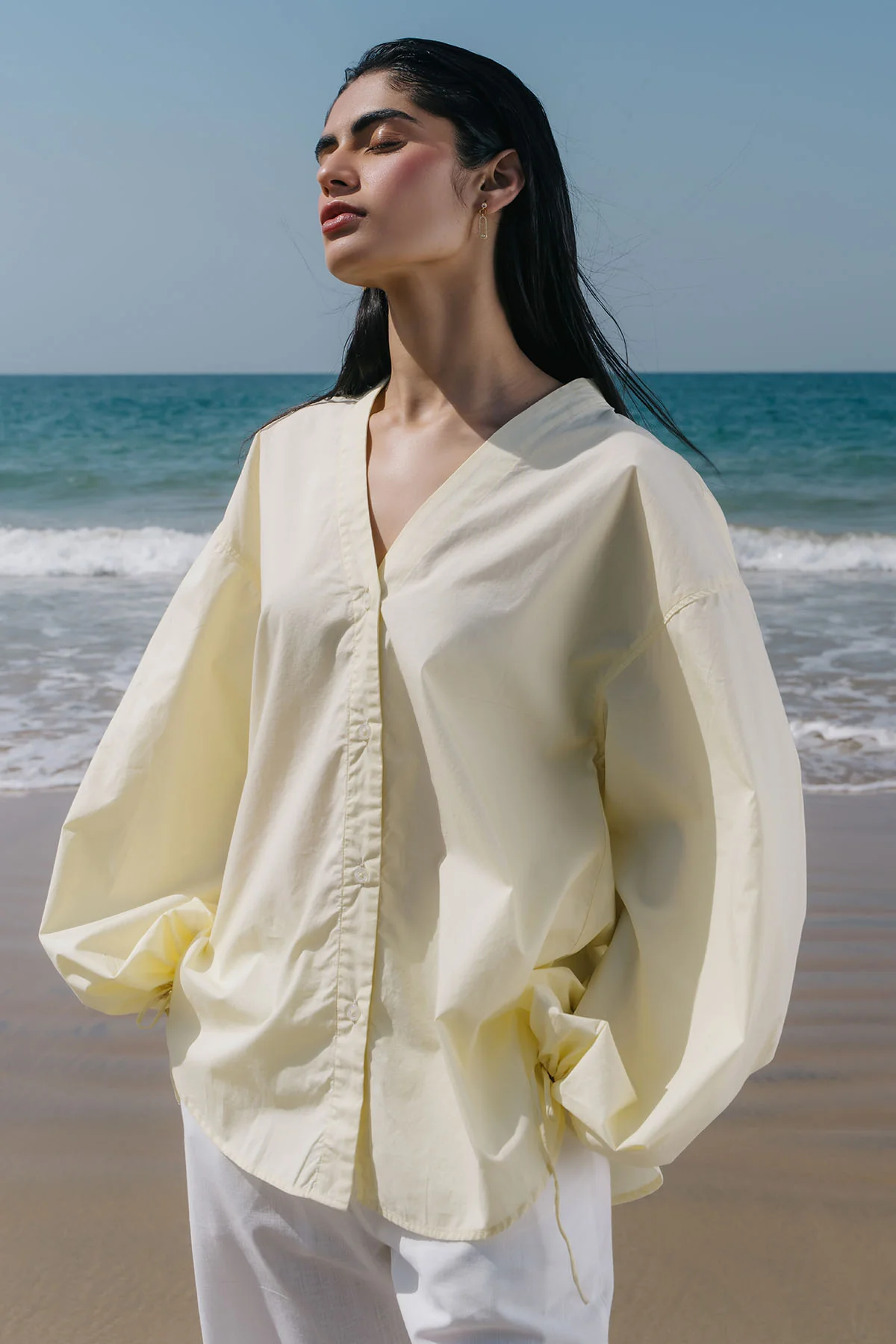 Designed for the modern minimalist, the V-Neck Poplin Shirt blends refined tailoring with relaxed sophistication. Made from crisp, breathable poplin, it drapes effortlessly for a polished yet easygoing look. The clean V-neckline adds a touch of femininity, while the drawstring cuff details lend a subtle statement edge. Whether paired with structured trousers or relaxed denim, this piece brings effortless elegance to any wardrobe.
